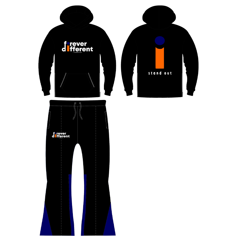 The UNISEX Pullover Oversized Forever Different Black Signature Classic Oversize Hoodie w/ "i" on the back and Forever Different on the front of Hoodie, with Forever Different Classic Black and Blue Panel Stack Pants is a bold statement piece for those who value individuality and cultural pride, these items are perfect for making a statement while embracing the ultimate in comfort and individuality. Featuring a modern fit and Perfect for everyday wear or standing out in a crowd and Crafted for those who embrace bold style and individuality.