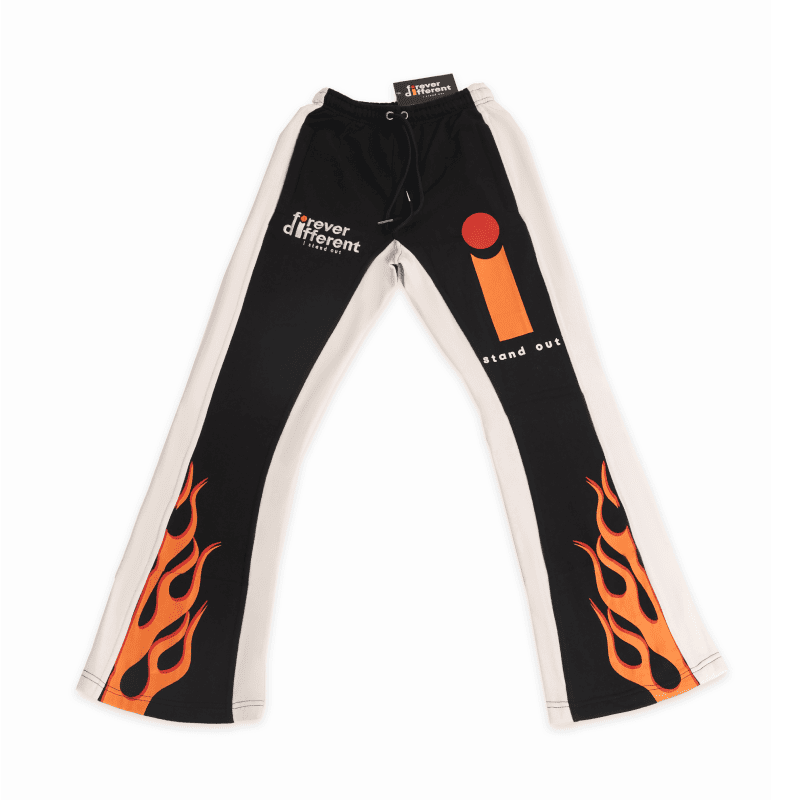 The UNISEX Forever Different "BOLD" i stand out Orange & Red Flames - Big i Stack Pants blends sleek urban fashion with everyday functionality. Featuring a modern fit and is a bold statement piece for those who value individuality and cultural pride. These pants are perfect for making a statement while ultimately embracing comfort and individuality. Perfect for everyday wear or standing out in a crowd. Crafted for those who embrace bold style and individuality.