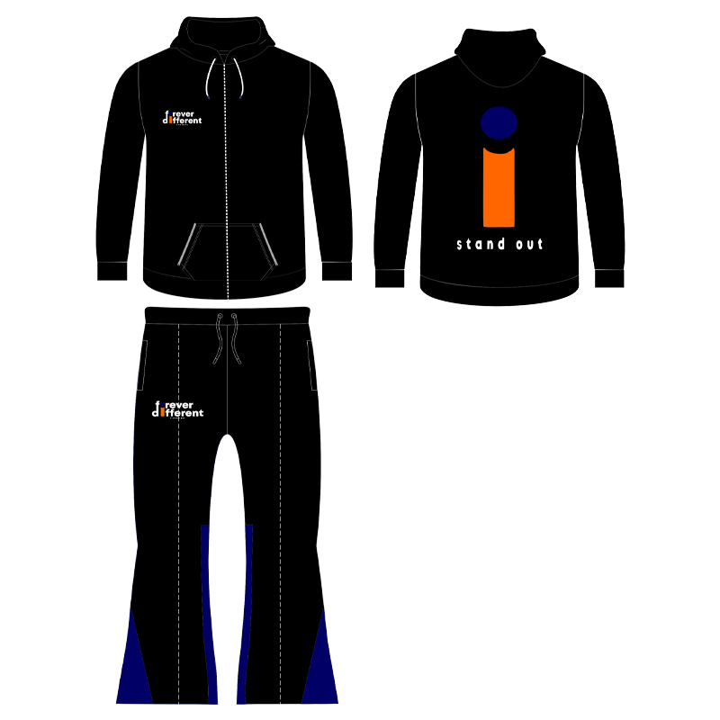 The UNISEX Forever Different Black and Blue Signature Classic Zip Up Hoodie w/ "i" on the back and Forever Different on the front of Hoodie, with Forever Different Classic Black and Blue Panel Stack Pants is a bold statement piece for those who value individuality and cultural pride, these items are perfect for making a statement while embracing the ultimate in comfort and individuality. Featuring a modern fit and Perfect for everyday wear or standing out in a crowd and Crafted for those who embrace bold style and individuality.